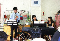 クラリネットの組み立て方や音域、奏法の紹介の後、クラシックやタンゴの演奏を楽しみました。中でもインナー・クライナーという曲は、演奏しながらひとつずつ管をはずし(下右写真)、最後にはマウスピースだけで演奏するというとてもおもしろい曲でした。ずいぶん短くなっても思った以上の音域が出るのに驚きました。 |