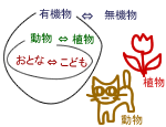 「大人」⇔「子供」、「山」⇔「海」、「全体」⇔「部分」…などといえば、みなさん「対立するもの」をどんどんイメージすることができるのではないでしょうか。でも、「動物」⇔「植物」という対立の中では、先ほどの「大人」⇔「子供」は同じ「動物」に入ります。このように、あるときには対立しているものが、他のときには対立しないということがあり、これを文脈の違いといいます。